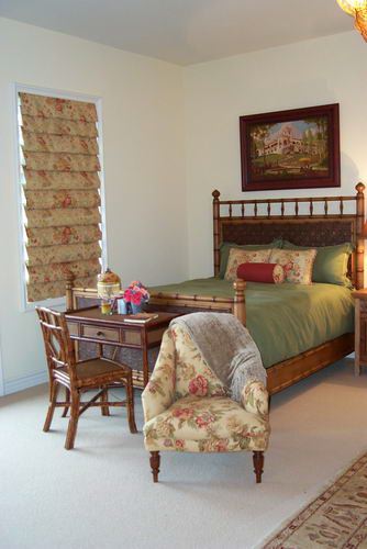 In this guest suite, we created Soft-Fold Roman Shades for the windows and Custom Bedding in matching floral and solid linens.