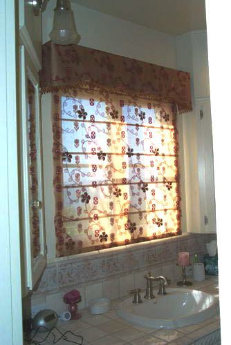To provide privacy without losing the ocean view from this cliff-top bathroom window, we used a sheer embroidered silk with a sheer lining to create the Flat Roman Shade. This Scalloped Lambrequin Valance is trimmed with crystal beads.