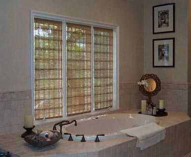 These are lovely “Conrad” Shades made of bamboo and other natural materials. They rise as Flat Romans, and offer a perfect balance between privacy and vista.